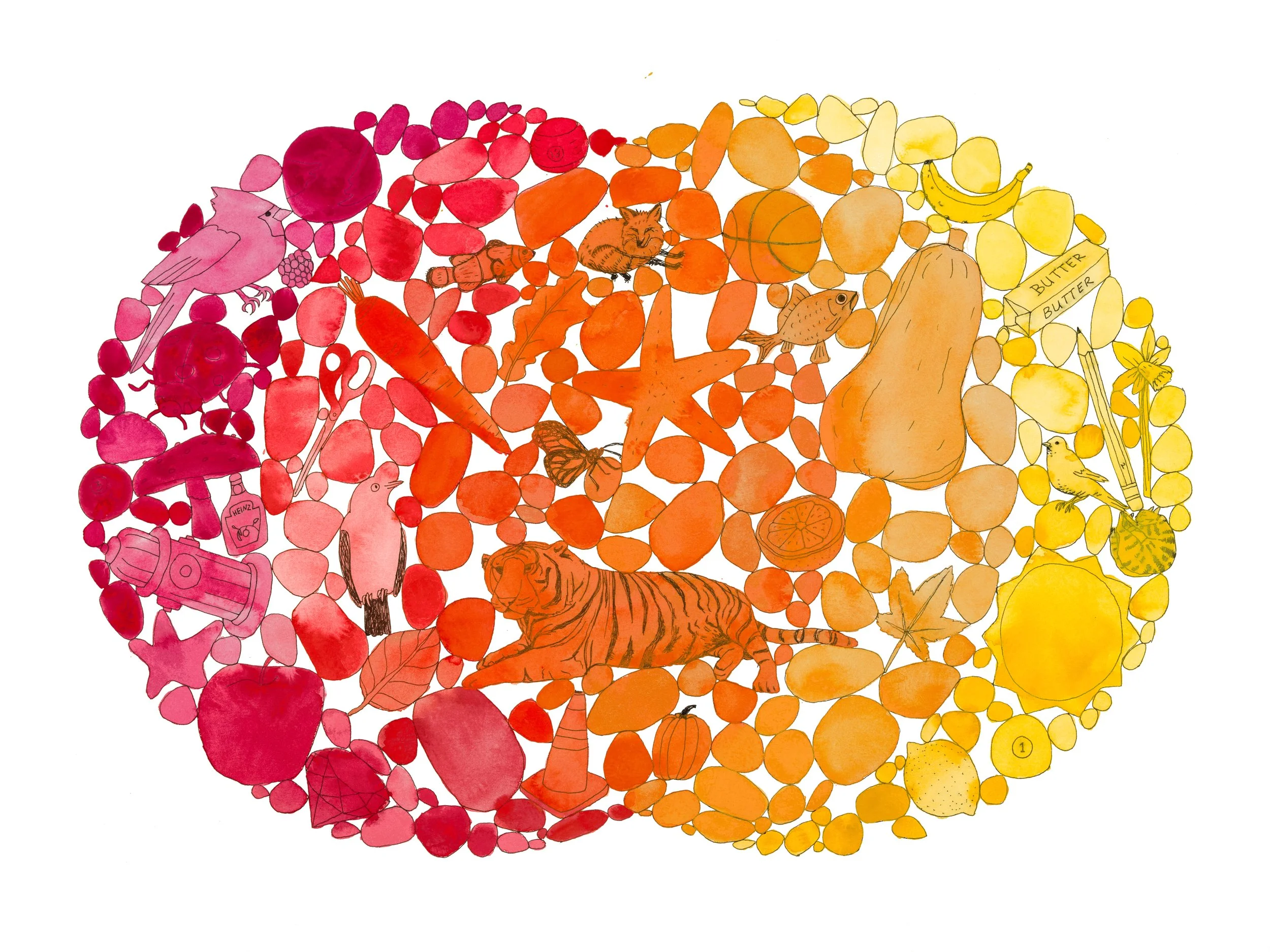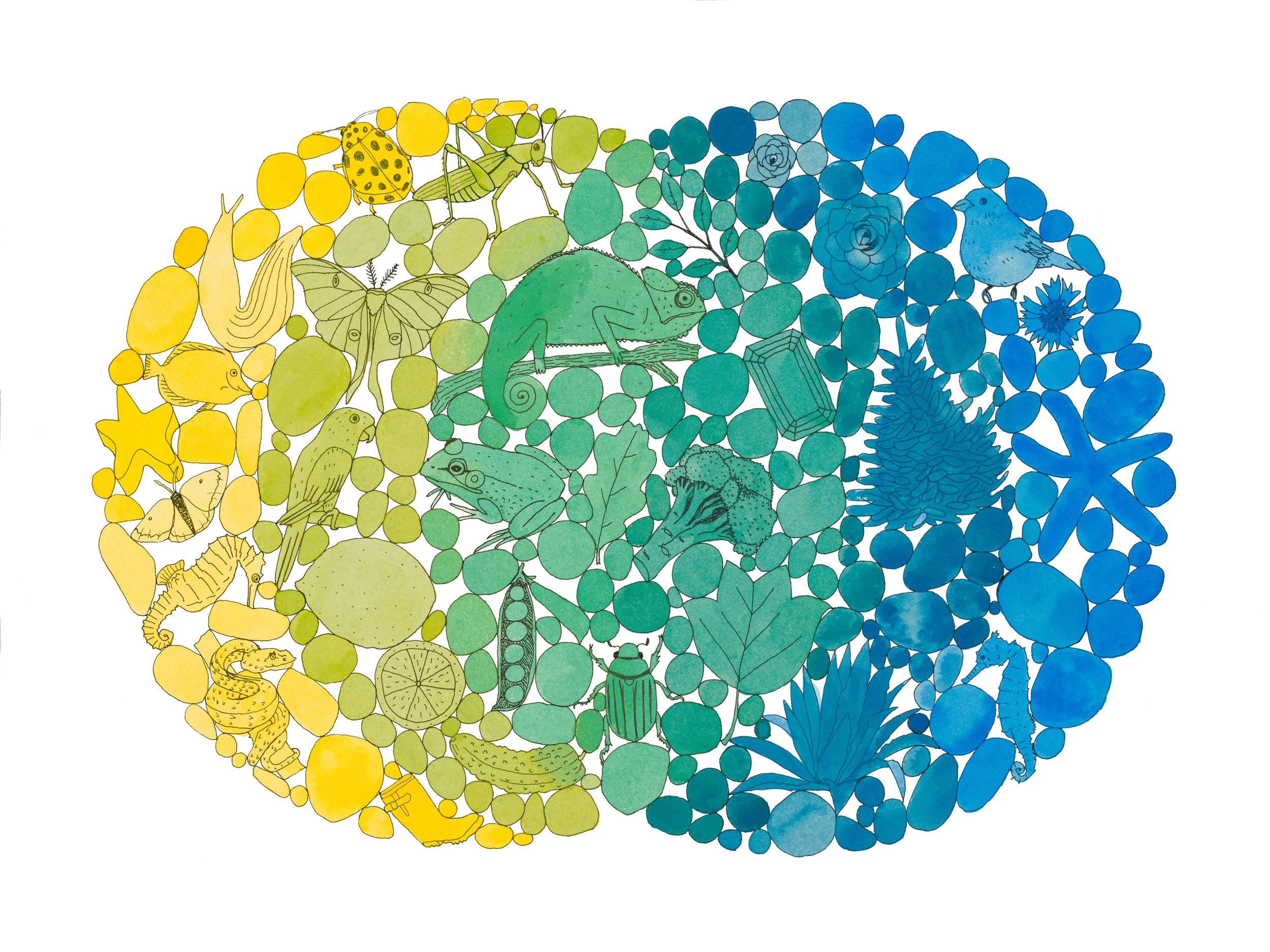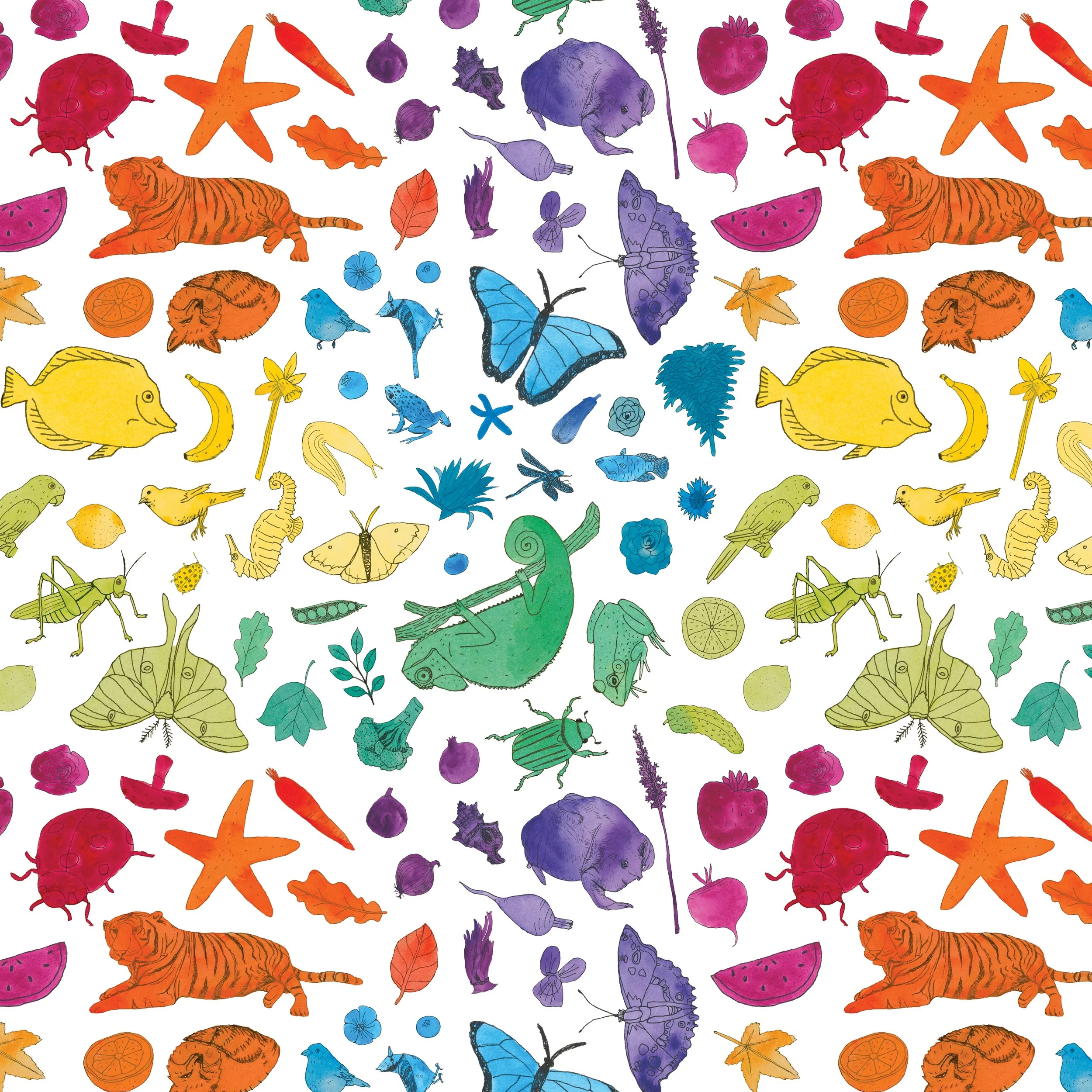 Children’s market surface designer working in soft shapes, colorful gouache, and playful lines.